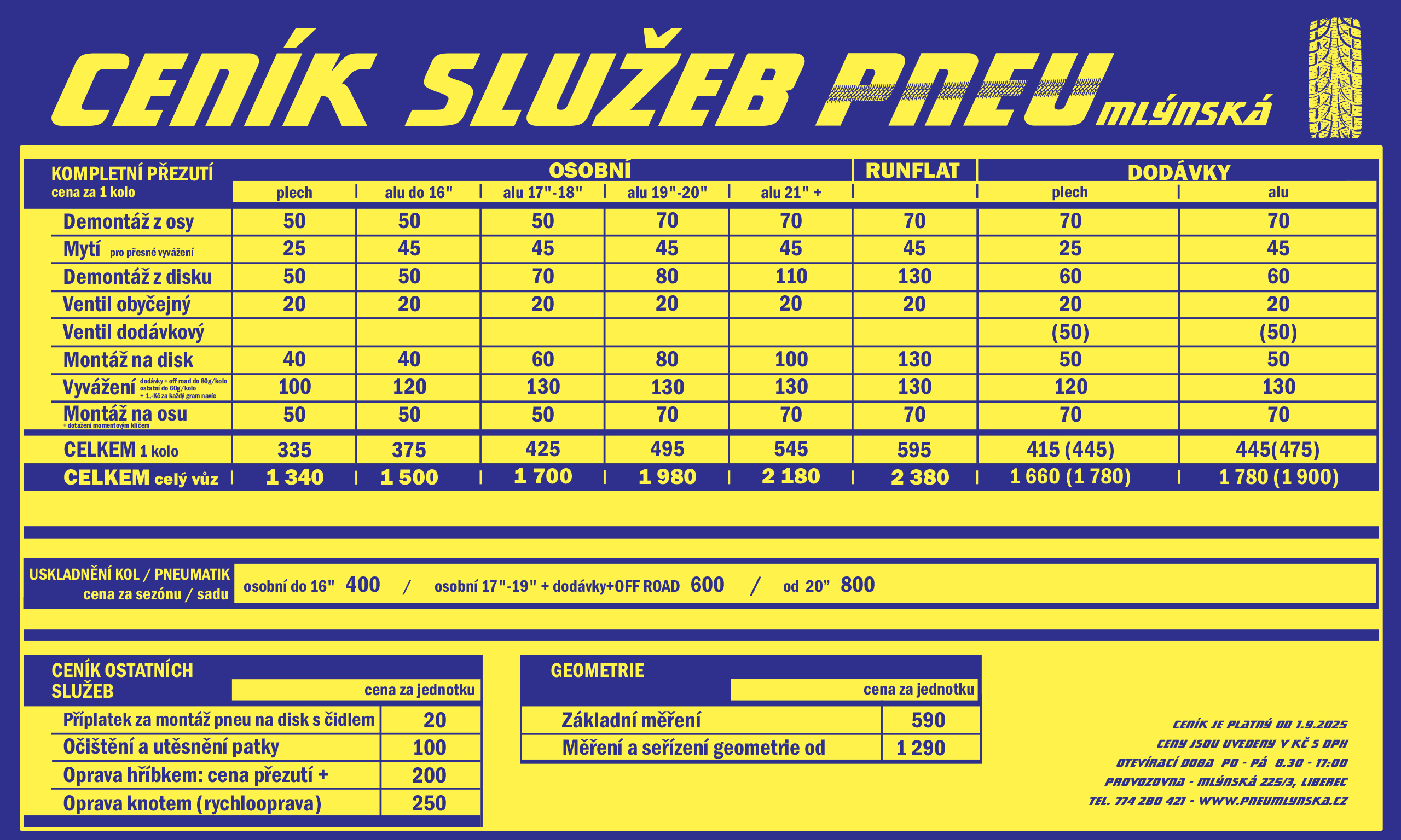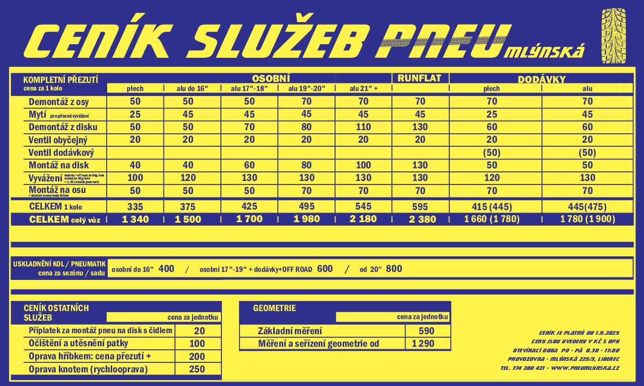 V tabulce níže najdete ceník služeb pro osobní automobily, dodávky, či off-road. Po rozkilknutí se otevře v plné velikosti v novém okně.